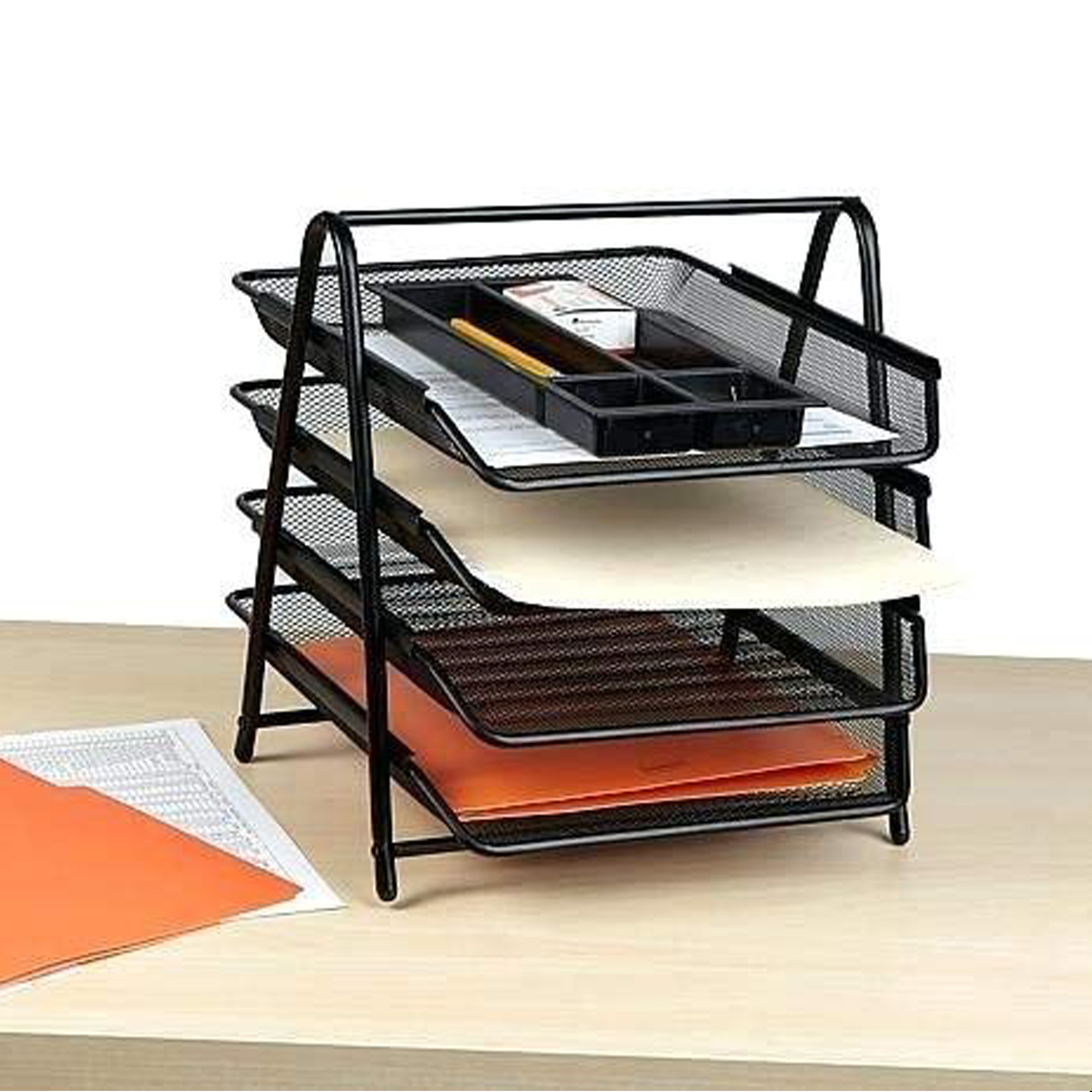(Enough GAP BETWEEN TRAYS) Our mail holder stops automatically at the back and prevents trays to slide out which helps to keep the files in place. This makes your life easier and organized. The drawer tiers won’t fall off even when you lift the organizer to move from one room to another room. The holder is easier to load due to its sliding, which are spaced quite apart. There are even rubber feet on the bottom to protect your desktop.
