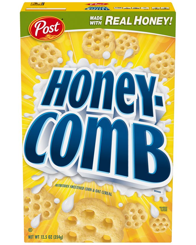 Post honeycomb cereal is a sweetened corn and oat cereal in a unique big honeycomb shape. Its honey-sweet taste has had kids of all ages loving this cereal for almost 30 years. Post honeycomb is an excellent source of whole grain (19 grams per serving), low in fat, and cholesterol free. This is sold in pack of four 12.5-ounce boxes. The Post cereal tradition began when C.W. Post made his first batch of “Postum”, a cereal beverage, in a little white barn in Battle Creek, Michigan.