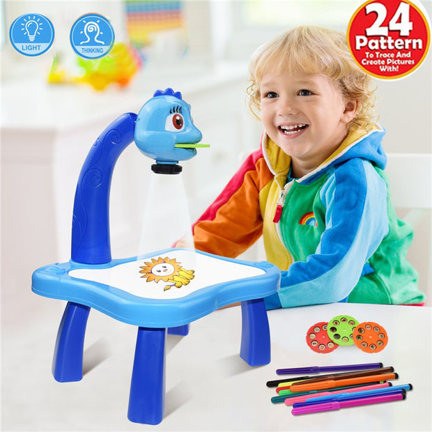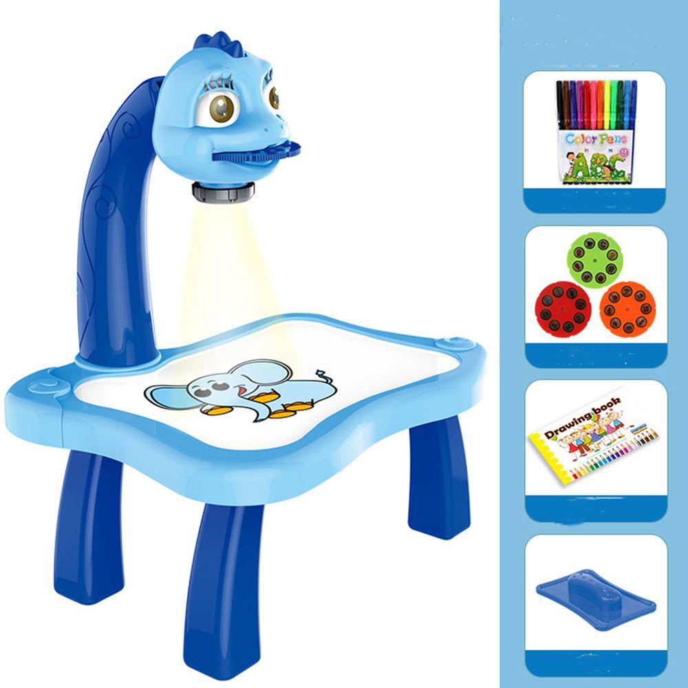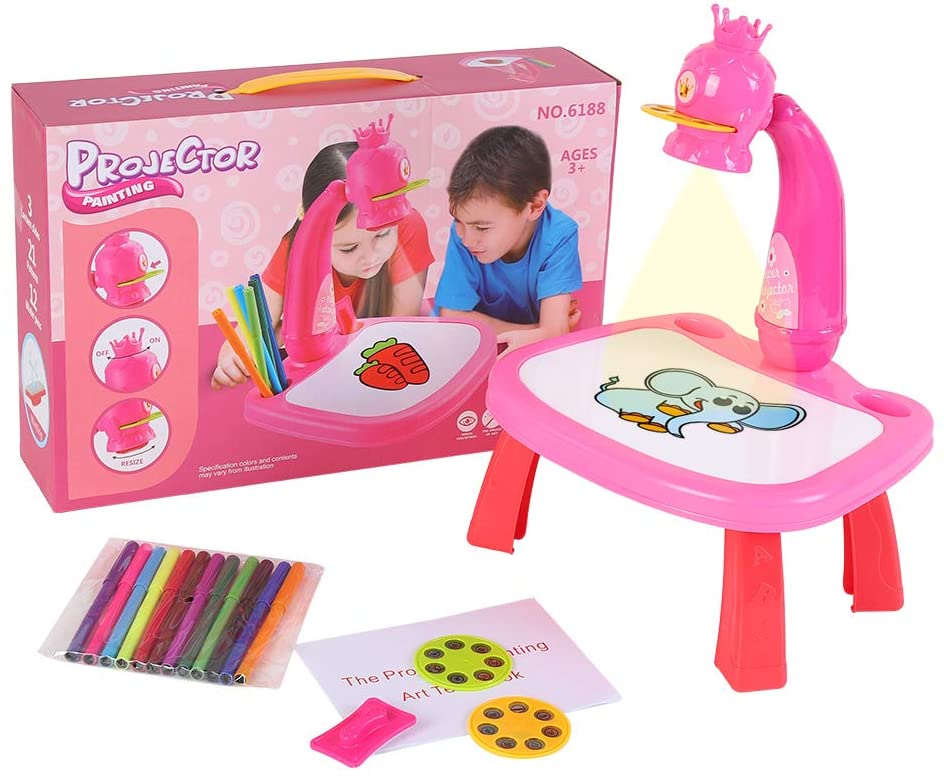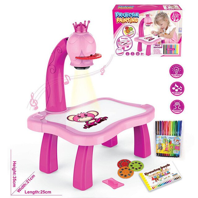 ✅ Great Educational Toy✅ Promoting Creativity And Imagination✅ Band of Colors✅ Color: Blue / Pink✅ Dimensions: 35.5cm*21cm*25cm✅ Battery: powered by 2 AA batteries (bring your own)✅ Suitable Age:3 ✅ Notice: Comes with 1 x Projector Table, 1 x Drawing Book, 12 x Water Pen, 1 x Eraser, 3 x Stencils., 24 Pattern